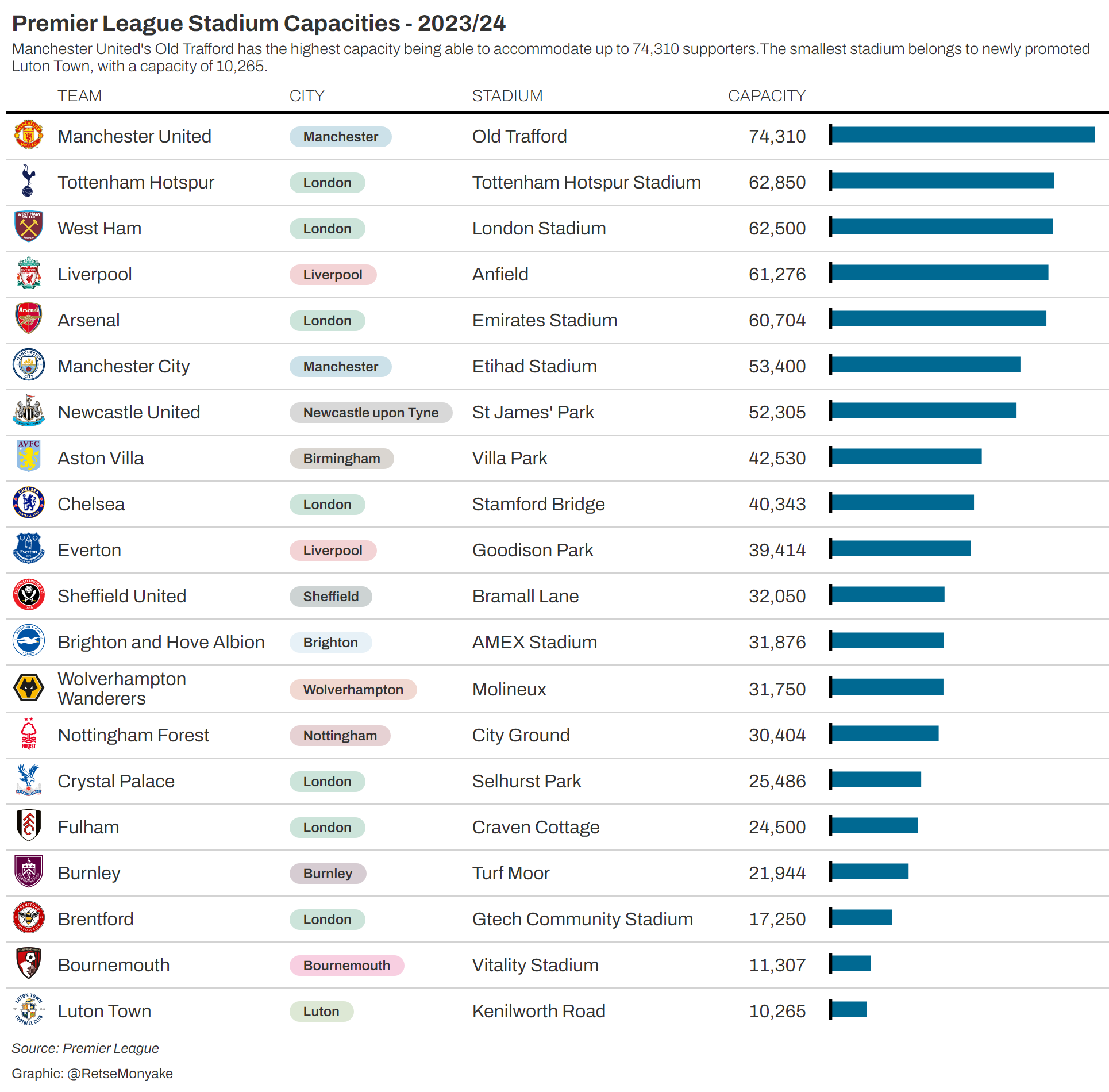 Premier League Stadium Capacities - 2023/24