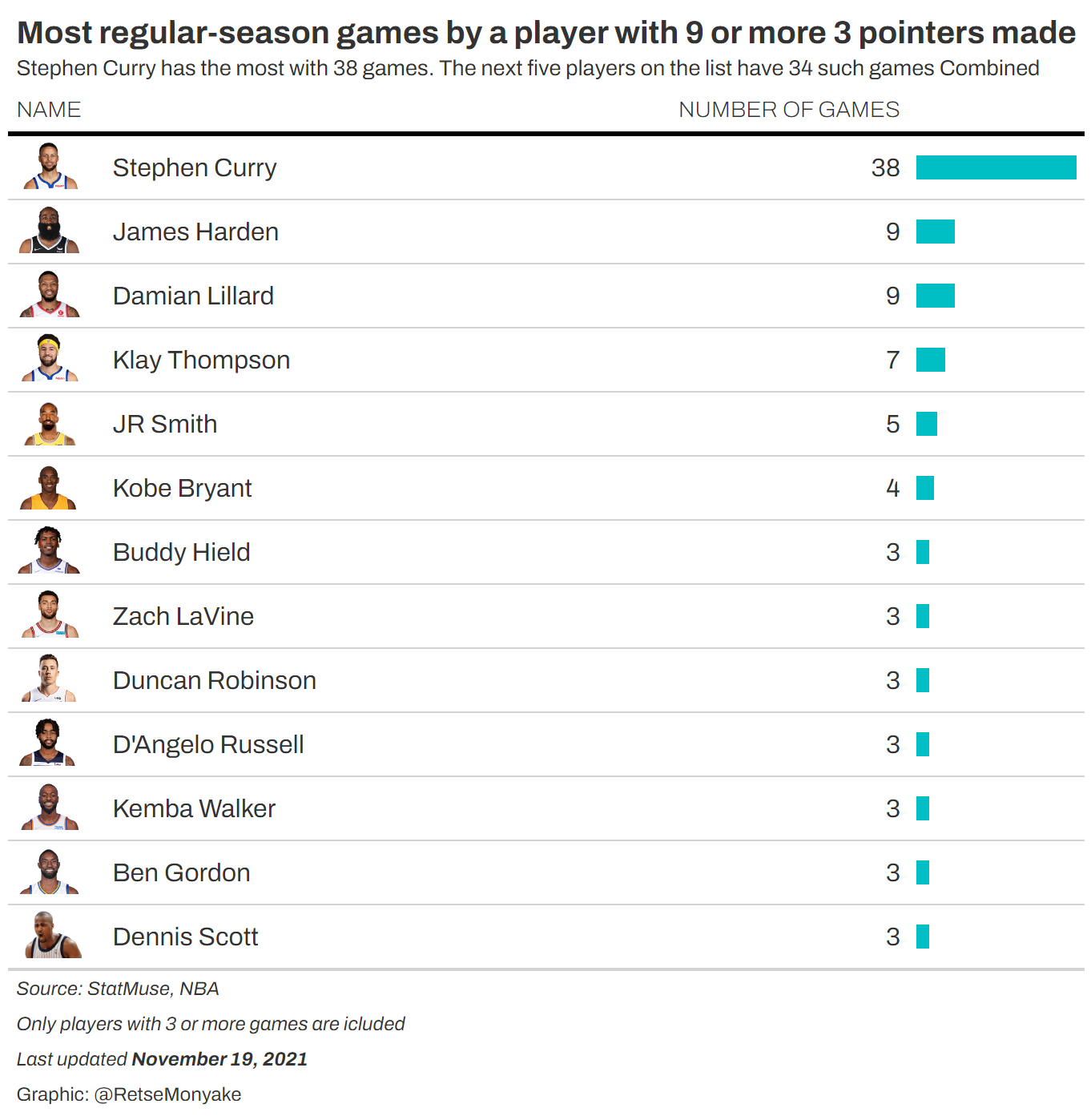 Most regular-season games by a player with 9 or more 3 pointers made
