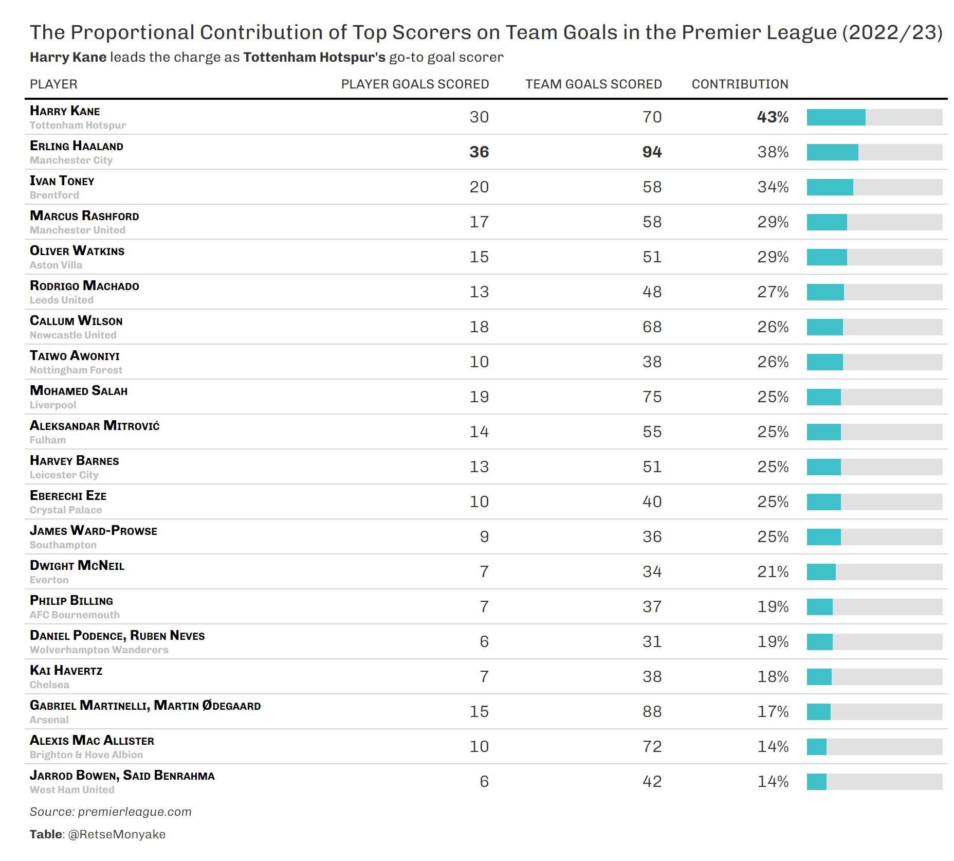 Contribution of top goal scorers in the premier league (2022/23)